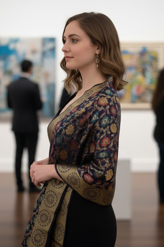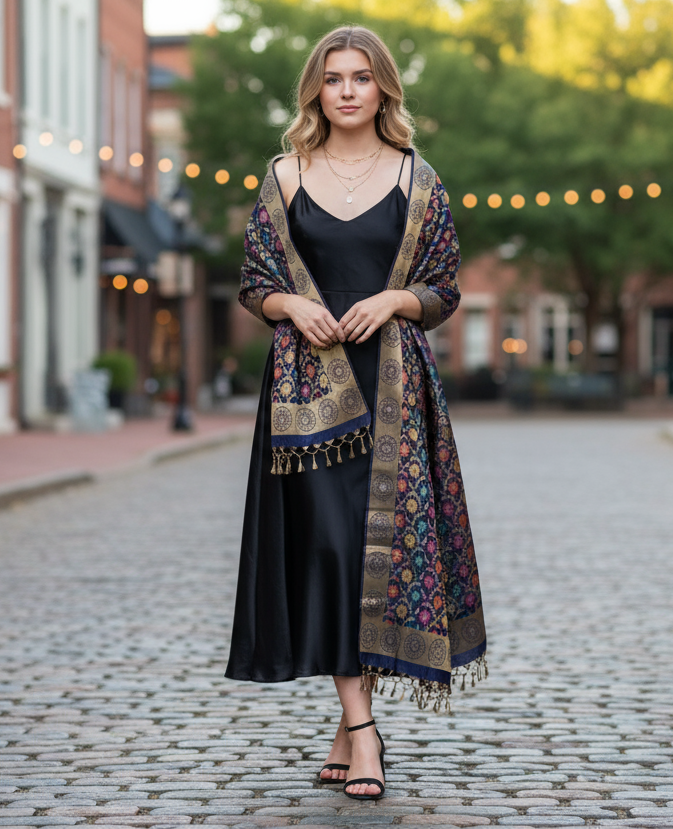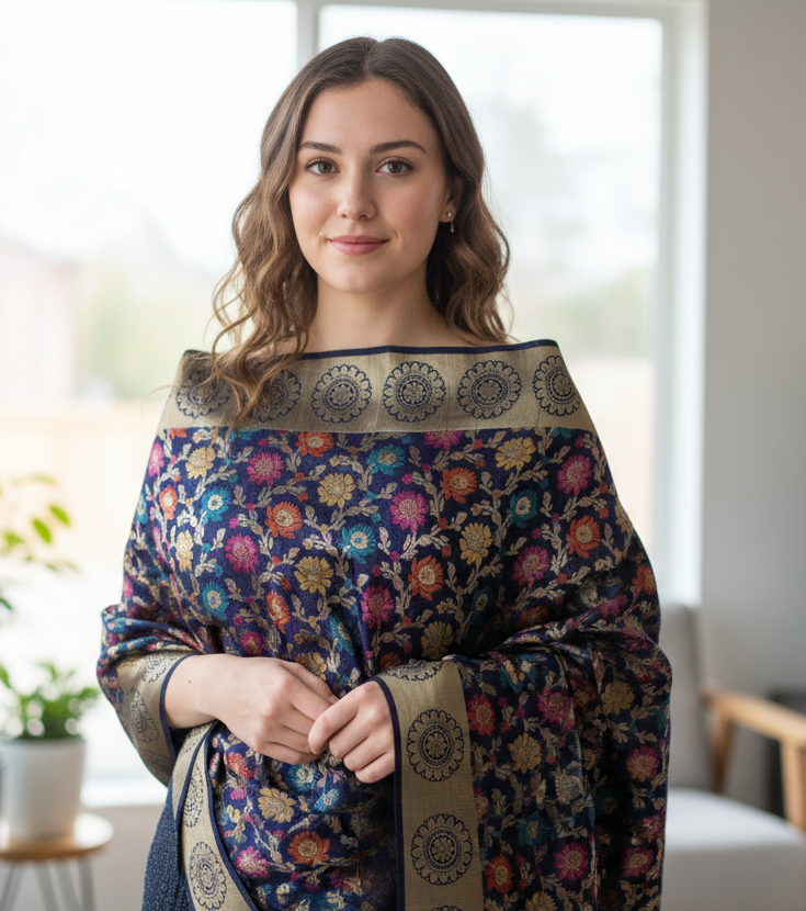 meenakari stole collection beautifully showcases the intricate artistry and rich tradition of Indian textiles, featuring vibrant patterns and luxurious fabric inspired by Banarasi craftsmanship. The stole displays a striking palette of deep blue highlighted with floral motifs and bordered with ornate gold zari-like detailing, making it a statement accessory for both traditional and contemporary outfits.